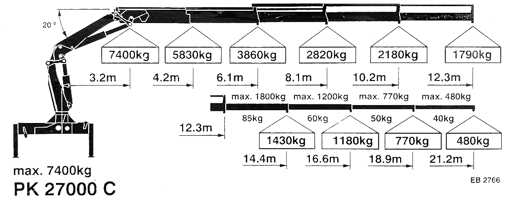 - Dĺžka výložníka: zasunutý 6500 mm, vysunutý 10 800 mm, s nadstavcom 13 800 mm